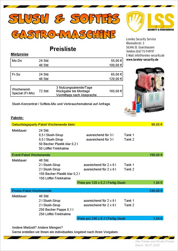 Slushmaschine - Preisliste